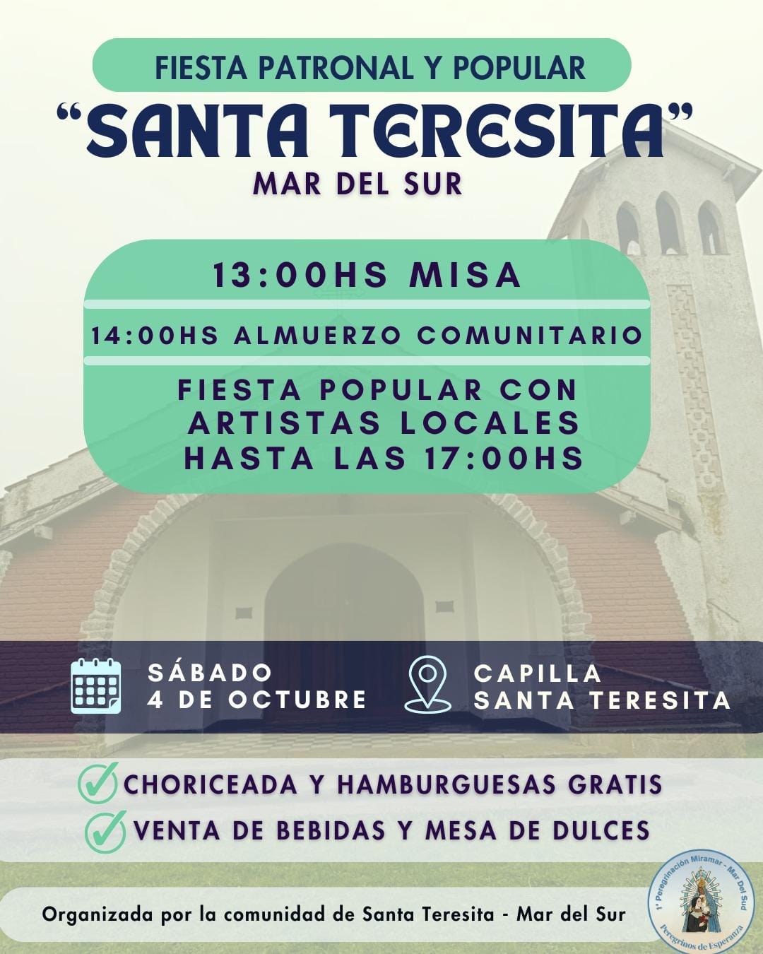 La Parroquia San Andrés Apóstol, de la cual depende la capilla Santa Teresita de Mar del Sud, convoca a la primera peregrinación a Mar del Sud titulada «Con Santa Teresita caminamos».