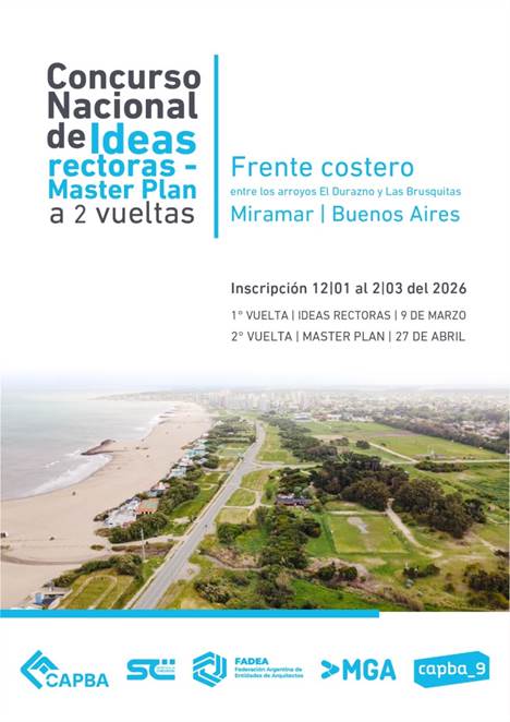 El Colegio de Arquitectos de la Provincia de Buenos Aires – Distrito IX, en conjunto con la Municipalidad de General Alvarado, convoca al Concurso Nacional de Ideas Rectoras y Master Plan, a dos vueltas y carácter no vinculante, para el desarrollo del frente costero de la ciudad de Miramar, entre los arroyos El Durazno y Las Brusquitas.